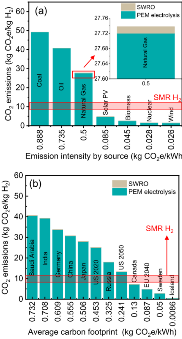 图6:(a) SWRO-PEM电解过程的CO2排放量(kg CO2e/kg H2)汇总,具体取决于电力来源,以及(b)基于不同发电辖区碳释放强度。(a) 的插图显示了SWRO-PEM电厂使用天然气电厂的电力产生的二氧化碳排放的放大图。典型的SMR过程碳释放显示为阴影红色区域 SWRO-PEM在实际的情况下的二氧化碳排放量