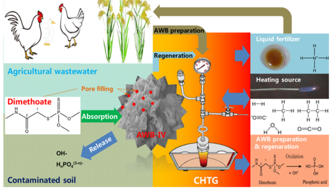 作者团队旨在将农业废物的能源利用与通过氢气和使用共水热气化 (CHTG) 生产生物炭从农业废水中吸附乐果 (DT) 结合起来。评估了稻壳 (RH) 和鸡粪 (CM) 五个比例的CHTG后的气化行为以及生物炭在DT上的相应吸附性能。结果表明,3RH +1CM的原料达到了最大的气体产率和氢气气化效率 (HGE),对衍生生物炭的最高吸附容量为3.57 mg g − 1。表面表征和元素分析表明,在不同C/N比下衍生的生物炭差异很大。农业废弃物衍生生物炭 (AWB) 在五个再生和吸附循环中的优异性能表明,AWB是一种绿色稳定的农田尾水吸附材料。此外,还全面讨论了废吸附剂水热气化 (HTG) 再生过程中DT的降解途径。CHTG处理提高了RH和CM的气态产物的收率,并产生了对DT具有高吸附能力的AWBs。这为农业废物的资源利用和利用农药残留处理农业废水提供了绿色高效的技术。