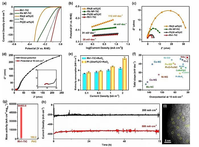 在成功将Rh单原子负载在纳米TiC载体上得到Rh单原子催化剂(Rh1-TiC)之后,作者对其进行了详细的表征。他们发现,由于Rh-Ti之间EMSI作用,Rh在价态在0-2价之间,d轨道填充度较高,位点具有富电子性质。并且,Rh单原子周边配位结构是Rh-Ti2C2结构,与计算结构相符。为了进一步验证EMSI设计策略的可靠性,他们进行了电催化测试。电流密度为10 mA•cm-2时,过电位仅为22 mV,Tafel斜率仅为25 mV•dec-1。并且,由于Rh的负载量只有0.31 wt%,其质量活性高达54403.9 mA•cm-2•mgRh-1。最重要的是,在高电流密度下,其展现了很好的稳定性,具有良好的实际应用前景。