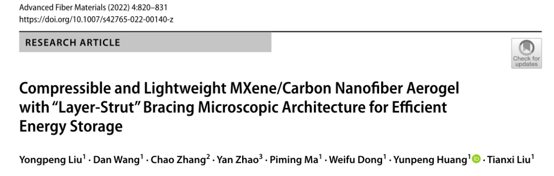 2、可压缩和轻量级的MXene/碳纳米纤维气凝胶,具有“层-支柱”支撑的微观结构,用于高效的能量存储