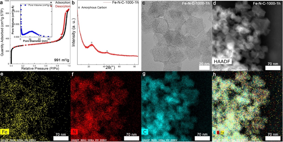 图4 最佳样品Fe-1000-1h的BET/XRD/TEM 表征结果
