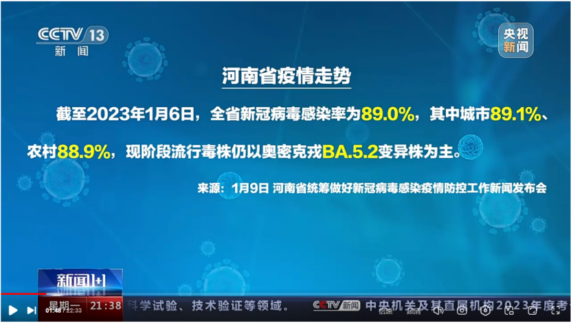 根据1月9日河南省官方公布的数字,截至2023年1月6日,河南省新冠病毒感染率为89.0%。