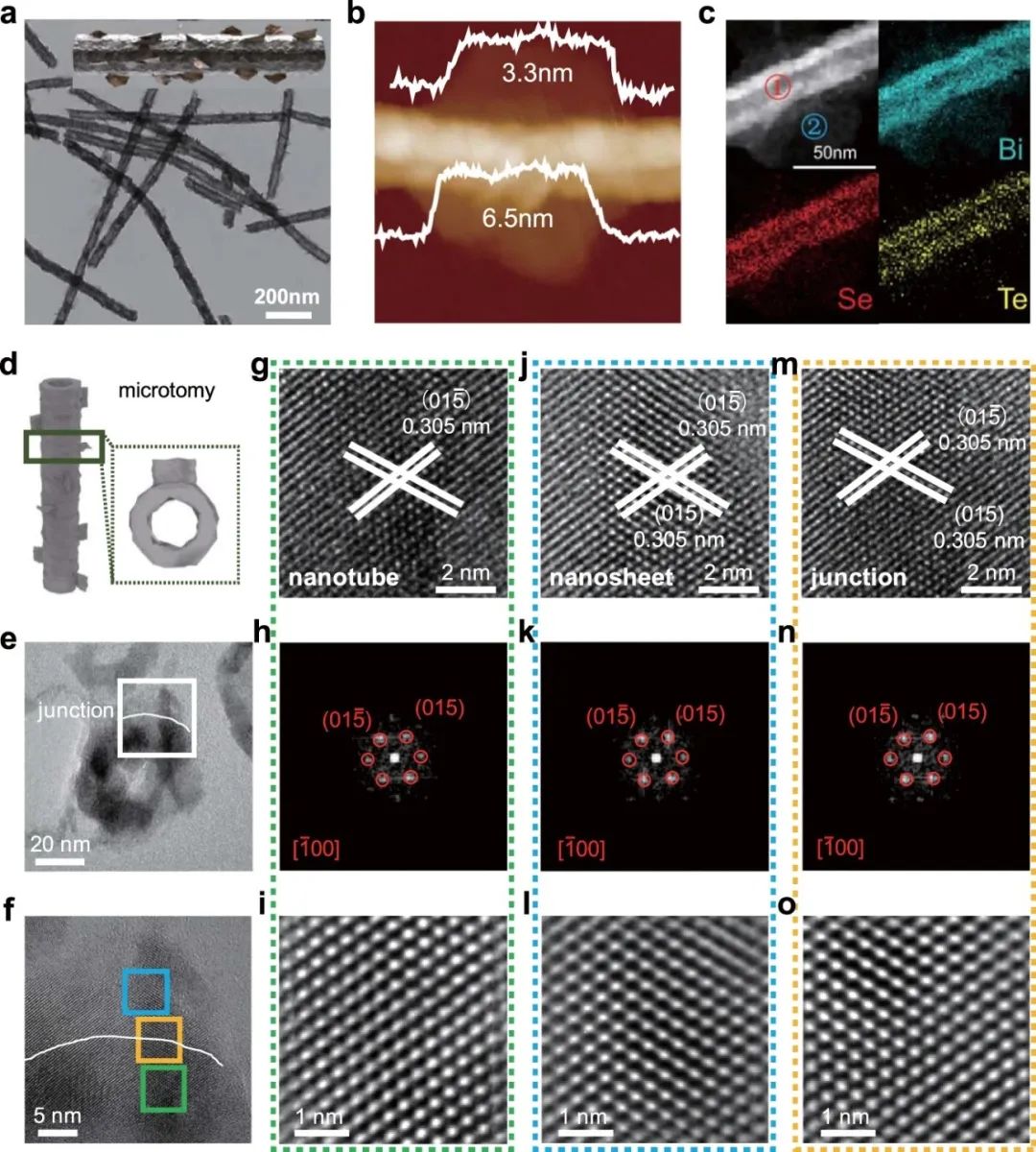 a. BST-MHs的TEM图像。插图是示意图的几何模型。b. BST-MHs的AFM图像。c. BST-MHs的EDS映射图像。d. BST-MHs的切片示意图。e, f. 接合点的TEM图像和HRTEM图像。g–i. (f)绿域内纳米管的HRTEM图像、FFT和逆FFT。j-l. (f)蓝域内纳米片的HRTEM图像、FFT和逆FFT。m-o. (f)黄色域结的HRTEM图像,FFT,反FFT。