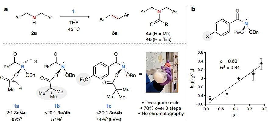 首先,作者选择仲胺2a为模板底物,将其与N-苄氧基-N-乙酰氧基苯甲酰胺1a在四氢呋喃为溶剂的条件下于45 ℃进行反应(图2a),以35%的收率得到去氮产物3a,同时得到了副产物乙酰胺4a,后者可能是通过取代酰基碳而形成的。为此,作者合成了N-特戊酰氧基衍生物1b并在相同的条件下进行反应。值得一提的是,没有检测到相应的特戊酰胺副产物4b,同时以57%的收率得到3a。进一步的研究表明对位三氟甲基取代的试剂1c效果更好(2a在5 h内便可完全转化),特别是1c能以数克规模制备:从市售试剂出发,经三步操作便可制得28 g产物(总收率:78%),并且无需色谱纯化。此外,将反应速率与亲电取代基常数(σ+)作图时,Hammett研究表明斜率为0.60(图2b)。不过,使用标准程序却无法制备出比1c更缺电子的试剂。