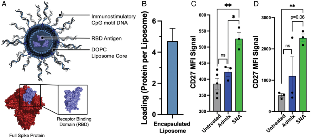 近日,Chad A. Mirkin团队使用 SARS-CoV-2 作为传染病的相关案例研究,研究了决定抗病毒球形核酸 (SNA) 疫苗功效的结构-功能关系,设计了一种抗病毒 SNA 疫苗,将受体结合域 (RBD) 亚基封装到脂质体中,并用致密的外壳装饰核心CpG 基序 toll 样受体 9 激动剂寡核苷酸。这种疫苗在人体细胞中能诱导记忆 B 细胞的形成,在体外有效激活人类细胞,在体内有效激活小鼠,且仅接种了一针SNA疫苗的小鼠在感染新冠病毒后就显示出了100%的存活率。