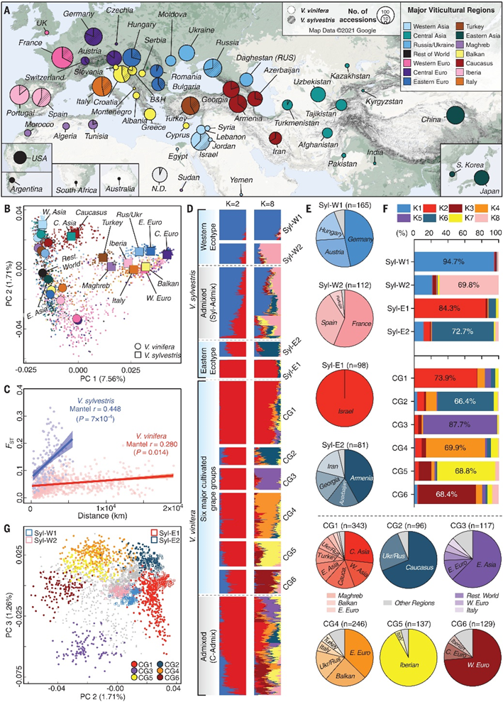 图 1. 全球核心V. sylvestris和V. vinifera种质的遗传多样性