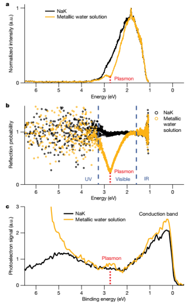 研究表明,将NaK液滴暴露在大约10-4 mbar的水蒸气压力下,几乎可以立即形成一层金色的金属水溶液。金色不能归因于干涉效应,因为当该层比相应的400-600纳米波长区域薄一个数量级以上时,就会出现金色。此外,作者没有观察到任何红到蓝的颜色偏移,这是在来自厚度接近可见光谱蓝色边缘波长的层的干涉的情况下所预期的。实验证实具有特征光泽的金色是水表面层的金属特征的标志。