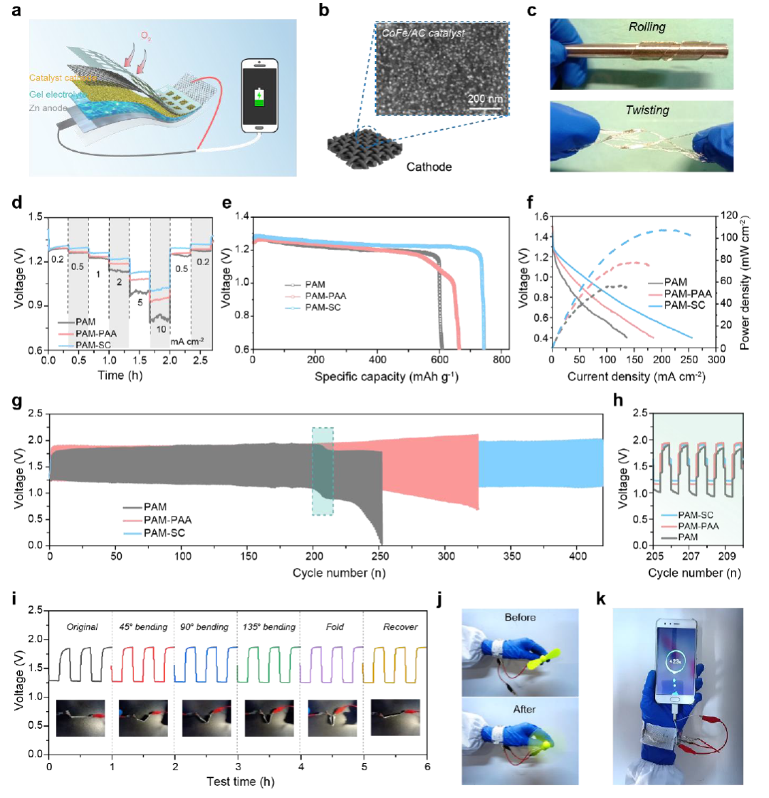 1. 这项工作开发了一种用于FZABs的聚丙烯酰胺-柠檬酸钠(PAMSC)极化凝胶电解质,其中SC含有丰富的-COO-功能团。
